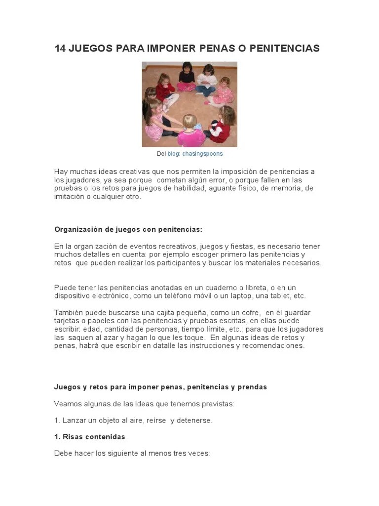Contiene una colección de penitencias y retos para organizar fiestas y juegos infantiles y de adultos. Divertido juego de penitencias con las madres de la plaguita. Sirven para jugar con niños y adultos; Y para variedad de espacios, como la escuela y campamentos juveniles. Desde juegos tradicionales a los que jugábamos de niños a otras ideas más originales perfectas para animar la fiesta y conseguir que todos . Aquí te dejamos los mejores.